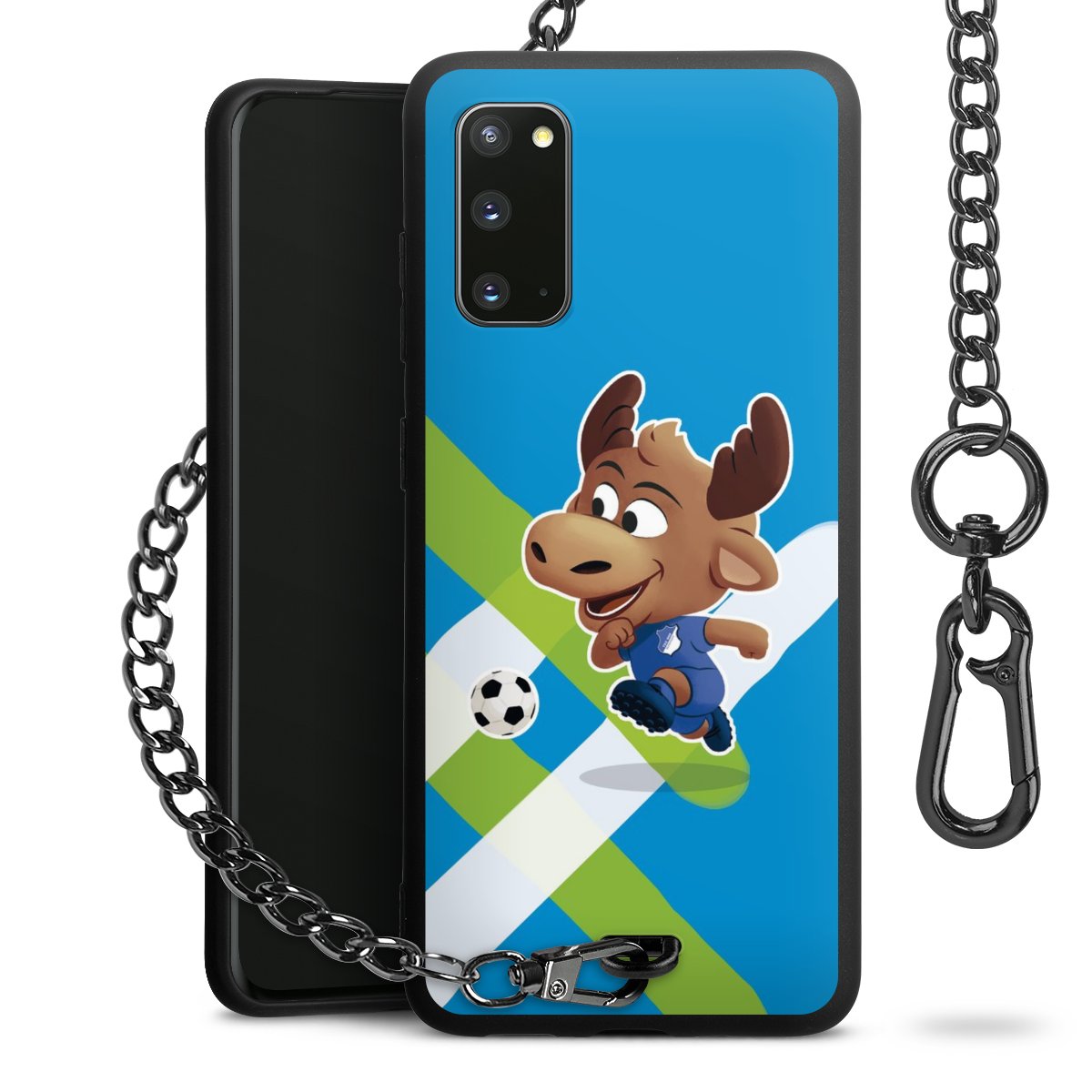 Die Handyhülle verfügt über eine mittig am unteren Rand platzierte Öse, an der die Metallkette stabil befestigt ist. Bestelle die Hülle einfach für Dein Smartphone-Modell, dann passt sie wie angegossen und Du brauchst sie bloß einmal anzudrücken. Handy in die Tasche, Karabiner an den Hosenbund – schon kann die Party starten.