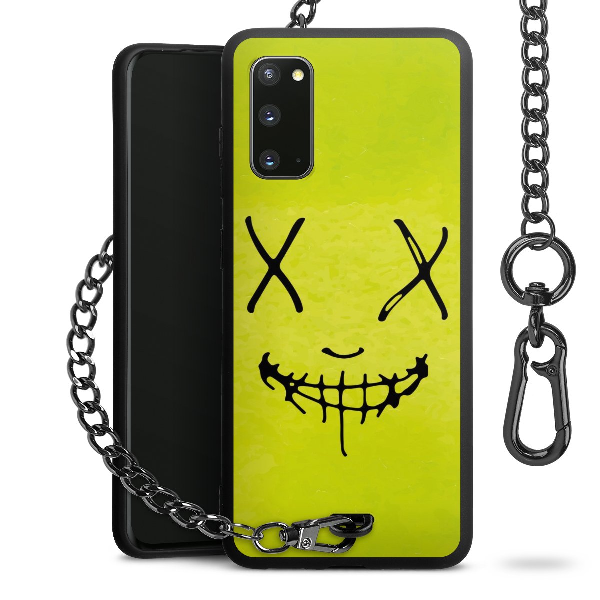 Die Handyhülle verfügt über eine mittig am unteren Rand platzierte Öse, an der die Metallkette stabil befestigt ist. Bestelle die Hülle einfach für Dein Smartphone-Modell, dann passt sie wie angegossen und Du brauchst sie bloß einmal anzudrücken. Handy in die Tasche, Karabiner an den Hosenbund – schon kann die Party starten.
