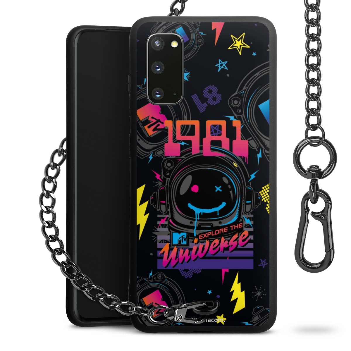 Die Handyhülle verfügt über eine mittig am unteren Rand platzierte Öse, an der die Metallkette stabil befestigt ist. Bestelle die Hülle einfach für Dein Smartphone-Modell, dann passt sie wie angegossen und Du brauchst sie bloß einmal anzudrücken. Handy in die Tasche, Karabiner an den Hosenbund – schon kann die Party starten.