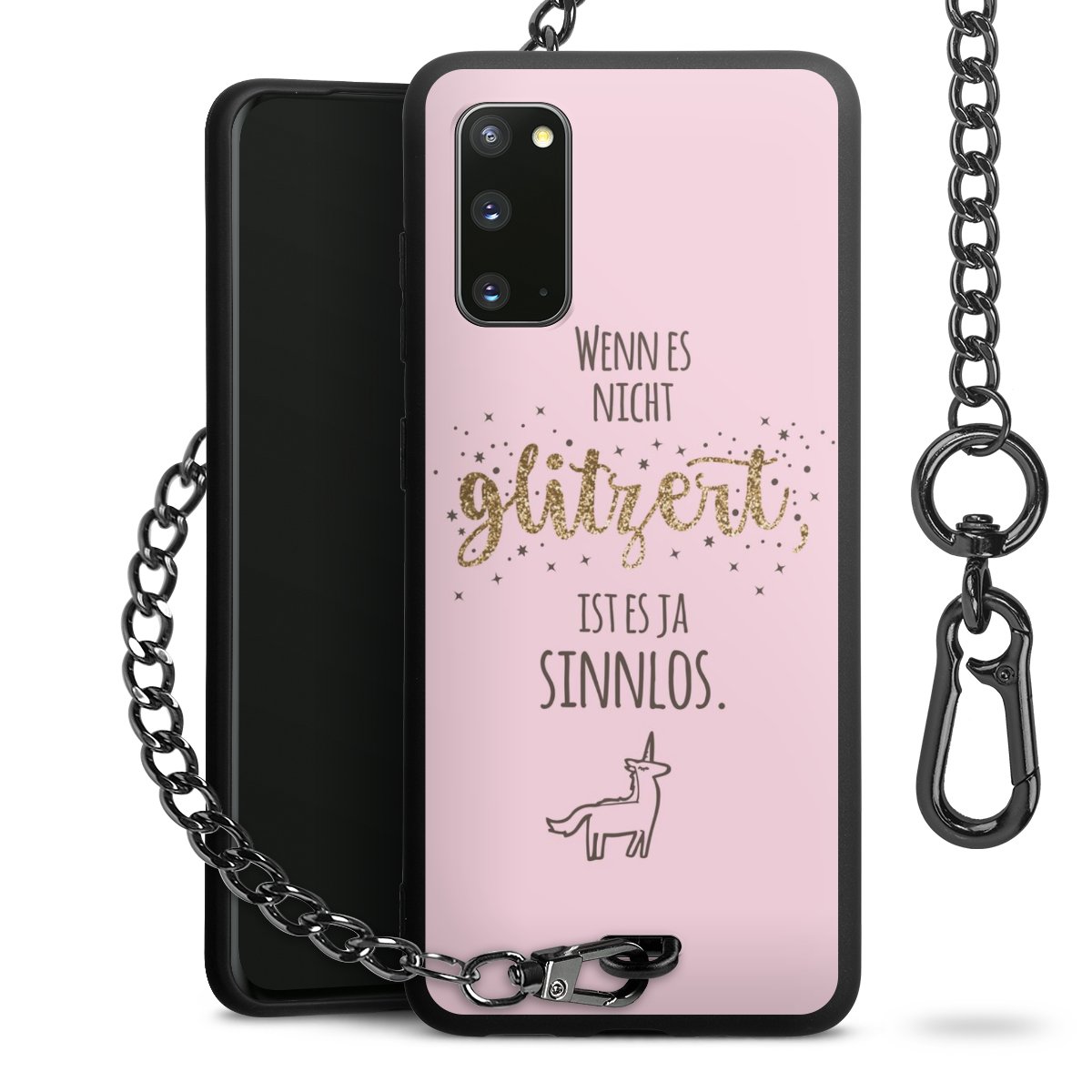Die Handyhülle verfügt über eine mittig am unteren Rand platzierte Öse, an der die Metallkette stabil befestigt ist. Bestelle die Hülle einfach für Dein Smartphone-Modell, dann passt sie wie angegossen und Du brauchst sie bloß einmal anzudrücken. Handy in die Tasche, Karabiner an den Hosenbund – schon kann die Party starten.