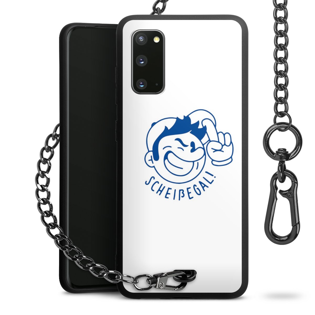 Die Handyhülle verfügt über eine mittig am unteren Rand platzierte Öse, an der die Metallkette stabil befestigt ist. Bestelle die Hülle einfach für Dein Smartphone-Modell, dann passt sie wie angegossen und Du brauchst sie bloß einmal anzudrücken. Handy in die Tasche, Karabiner an den Hosenbund – schon kann die Party starten.