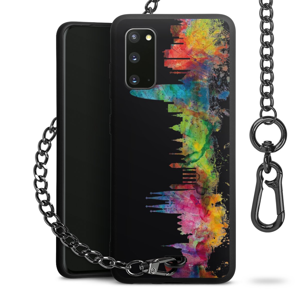 Die Handyhülle verfügt über eine mittig am unteren Rand platzierte Öse, an der die Metallkette stabil befestigt ist. Bestelle die Hülle einfach für Dein Smartphone-Modell, dann passt sie wie angegossen und Du brauchst sie bloß einmal anzudrücken. Handy in die Tasche, Karabiner an den Hosenbund – schon kann die Party starten.