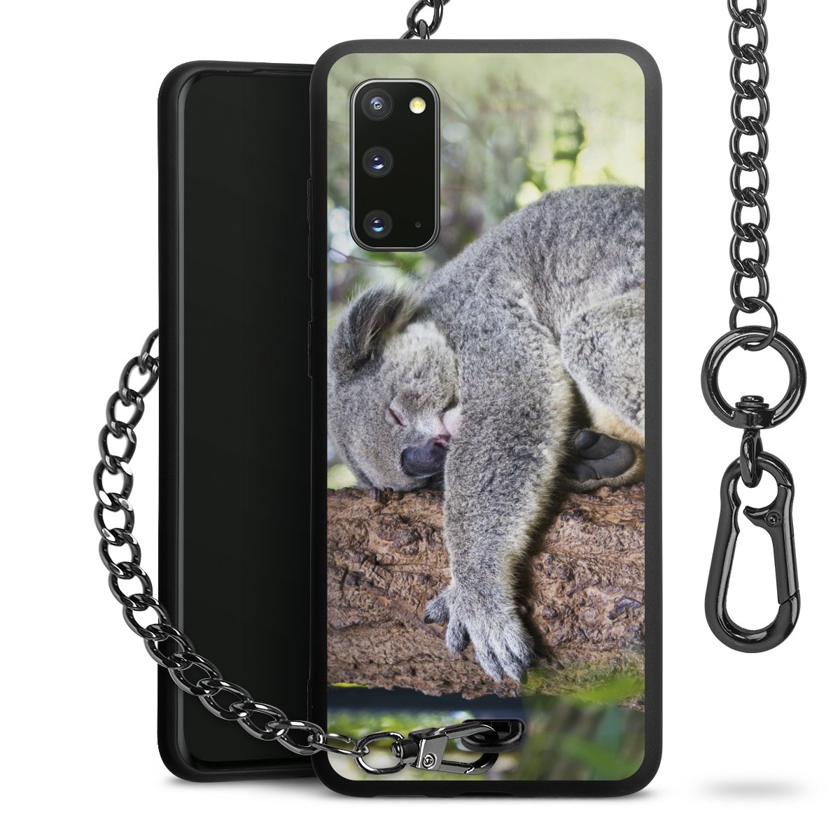 Die Handyhülle verfügt über eine mittig am unteren Rand platzierte Öse, an der die Metallkette stabil befestigt ist. Bestelle die Hülle einfach für Dein Smartphone-Modell, dann passt sie wie angegossen und Du brauchst sie bloß einmal anzudrücken. Handy in die Tasche, Karabiner an den Hosenbund – schon kann die Party starten.