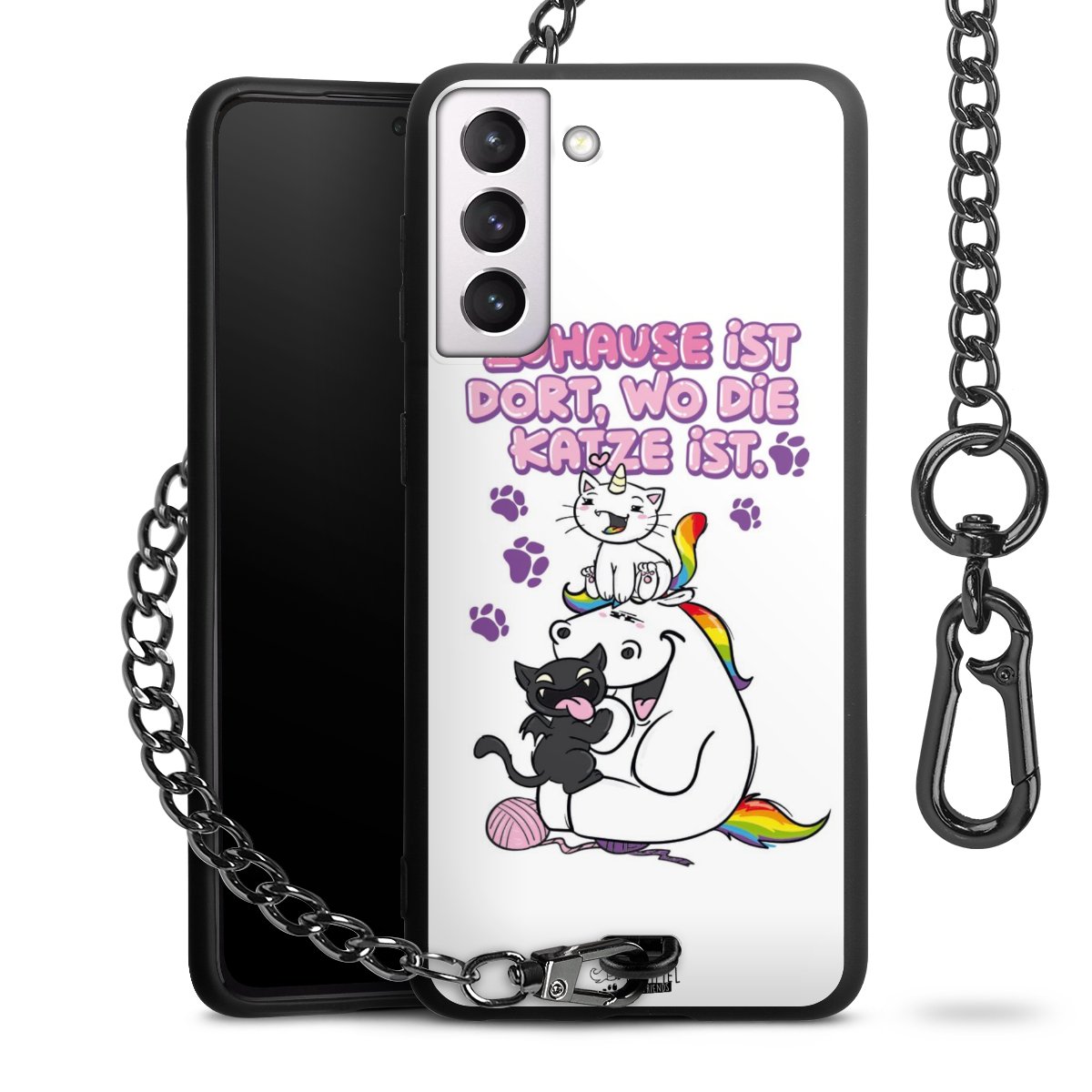 Die mattschwarze Silikon-Handyhülle besteht aus robustem TPU (thermoplastisches Polyurethan). Sie ist flexibel und schützt Dein Smartphone vor Stößen und Kratzern. Die Kette sowie der Karabinerhaken sind aus Metall in Gunmetal-Optik gefertigt. Für dieses Produkt kommen ausschließlich TÜV-geprüfte Materialien zum Einsatz.