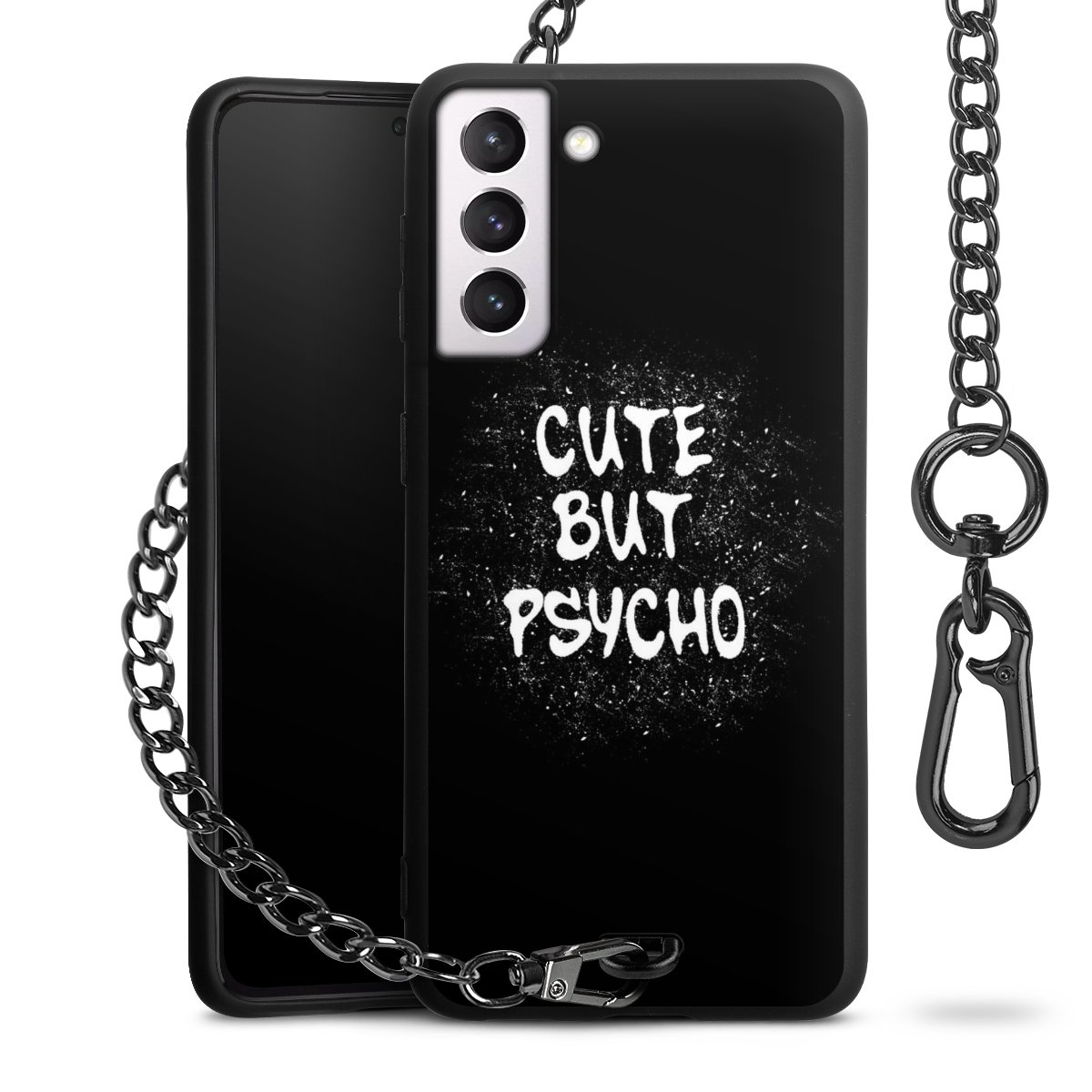 Die mattschwarze Silikon-Handyhülle besteht aus robustem TPU (thermoplastisches Polyurethan). Sie ist flexibel und schützt Dein Smartphone vor Stößen und Kratzern. Die Kette sowie der Karabinerhaken sind aus Metall in Gunmetal-Optik gefertigt. Für dieses Produkt kommen ausschließlich TÜV-geprüfte Materialien zum Einsatz.