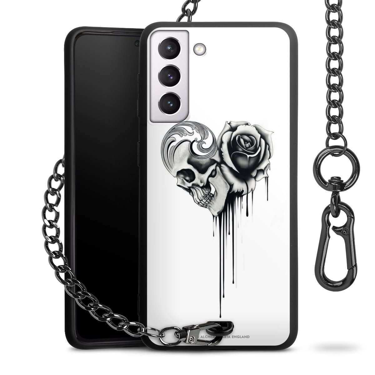 Die mattschwarze Silikon-Handyhülle besteht aus robustem TPU (thermoplastisches Polyurethan). Sie ist flexibel und schützt Dein Smartphone vor Stößen und Kratzern. Die Kette sowie der Karabinerhaken sind aus Metall in Gunmetal-Optik gefertigt. Für dieses Produkt kommen ausschließlich TÜV-geprüfte Materialien zum Einsatz.