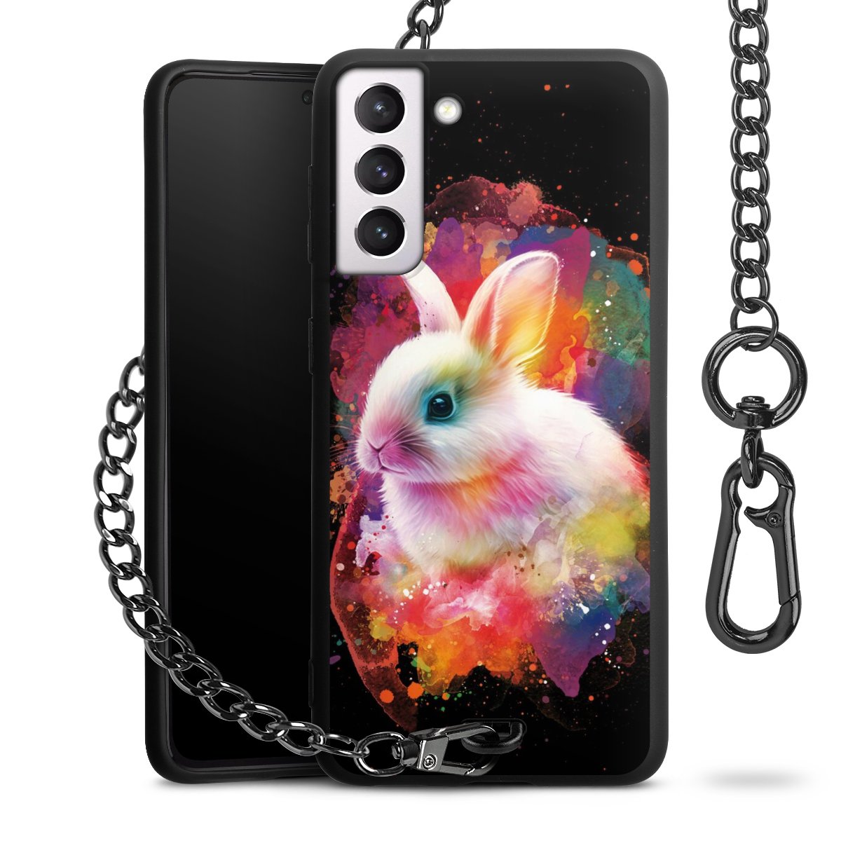 Die Handyhülle verfügt über eine mittig am unteren Rand platzierte Öse, an der die Metallkette stabil befestigt ist. Bestelle die Hülle einfach für Dein Smartphone-Modell, dann passt sie wie angegossen und Du brauchst sie bloß einmal anzudrücken. Handy in die Tasche, Karabiner an den Hosenbund – schon kann die Party starten.