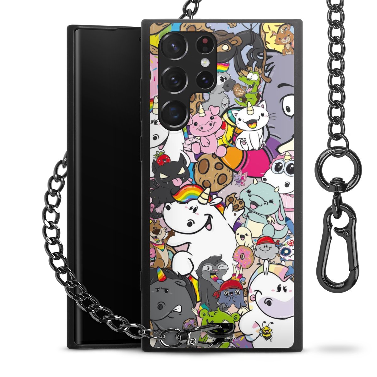 Die Handyhülle verfügt über eine mittig am unteren Rand platzierte Öse, an der die Metallkette stabil befestigt ist. Bestelle die Hülle einfach für Dein Smartphone-Modell, dann passt sie wie angegossen und Du brauchst sie bloß einmal anzudrücken. Handy in die Tasche, Karabiner an den Hosenbund – schon kann die Party starten.