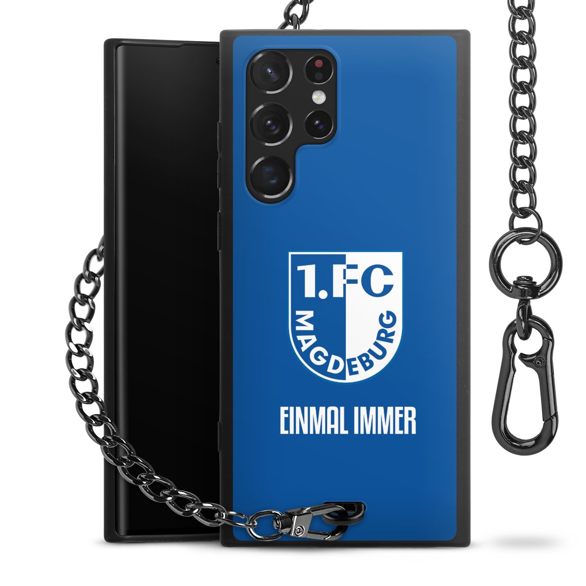 Die Handyhülle verfügt über eine mittig am unteren Rand platzierte Öse, an der die Metallkette stabil befestigt ist. Bestelle die Hülle einfach für Dein Smartphone-Modell, dann passt sie wie angegossen und Du brauchst sie bloß einmal anzudrücken. Handy in die Tasche, Karabiner an den Hosenbund – schon kann die Party starten.