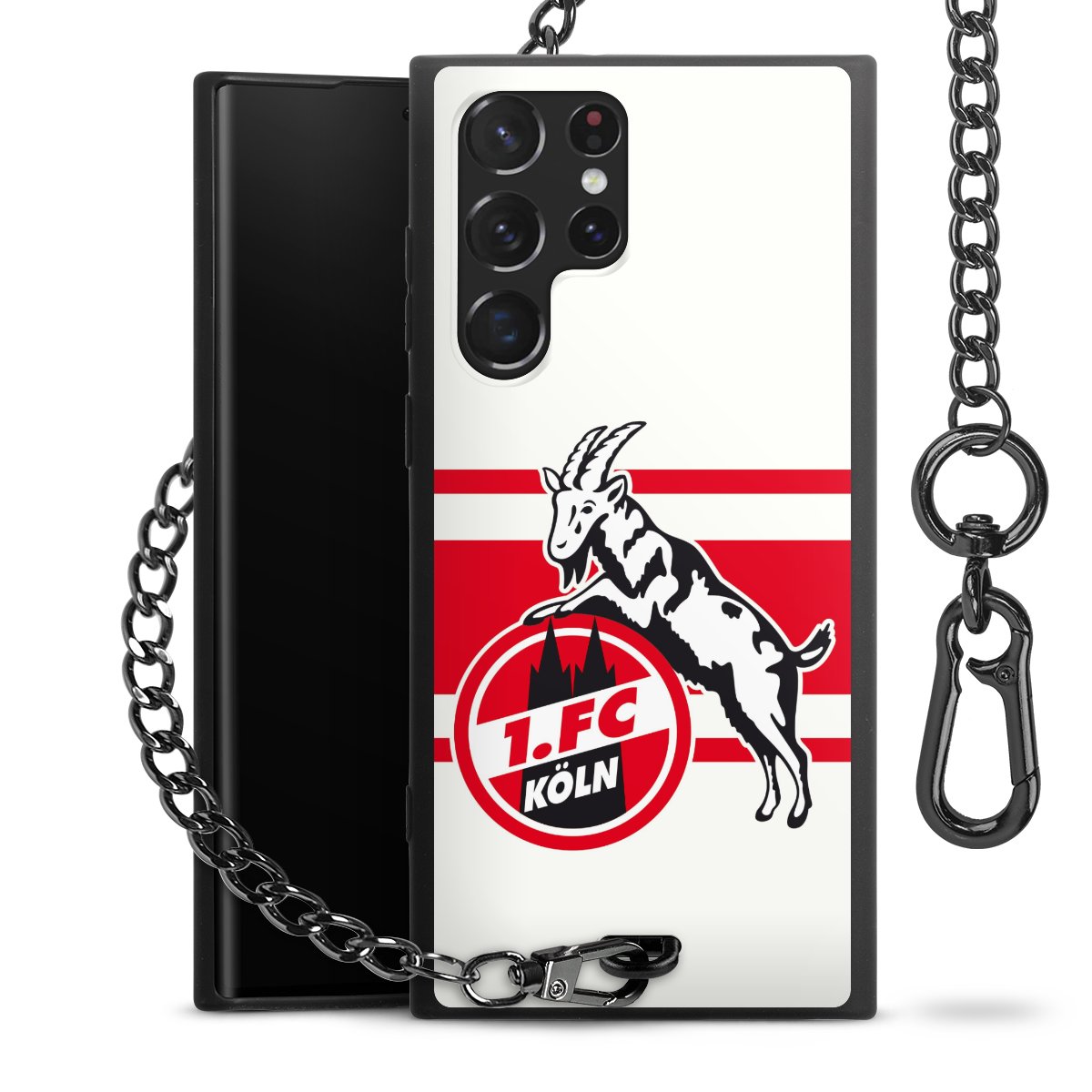 Die Handyhülle verfügt über eine mittig am unteren Rand platzierte Öse, an der die Metallkette stabil befestigt ist. Bestelle die Hülle einfach für Dein Smartphone-Modell, dann passt sie wie angegossen und Du brauchst sie bloß einmal anzudrücken. Handy in die Tasche, Karabiner an den Hosenbund – schon kann die Party starten.
