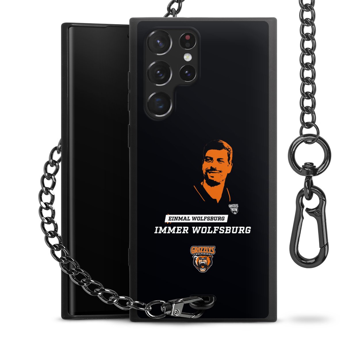 - Mattschwarze Handyhülle mit Metallkette