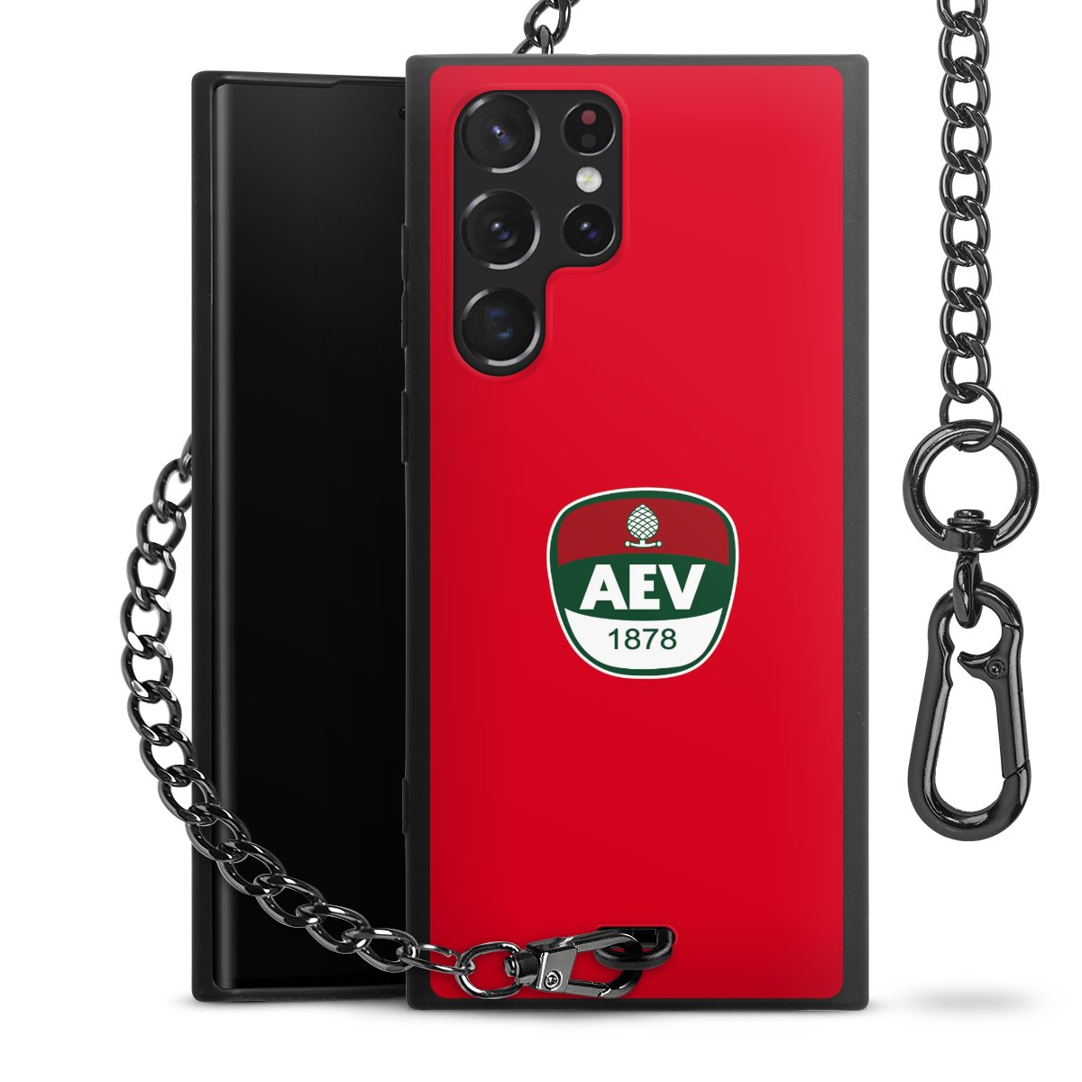 Die Handyhülle verfügt über eine mittig am unteren Rand platzierte Öse, an der die Metallkette stabil befestigt ist. Bestelle die Hülle einfach für Dein Smartphone-Modell, dann passt sie wie angegossen und Du brauchst sie bloß einmal anzudrücken. Handy in die Tasche, Karabiner an den Hosenbund – schon kann die Party starten.