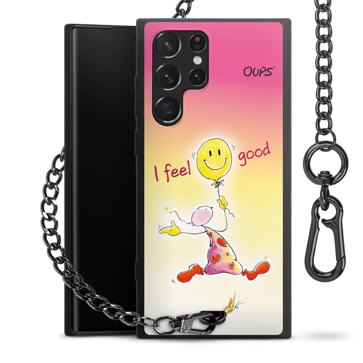 Die Handyhülle verfügt über eine mittig am unteren Rand platzierte Öse, an der die Metallkette stabil befestigt ist. Bestelle die Hülle einfach für Dein Smartphone-Modell, dann passt sie wie angegossen und Du brauchst sie bloß einmal anzudrücken. Handy in die Tasche, Karabiner an den Hosenbund – schon kann die Party starten.