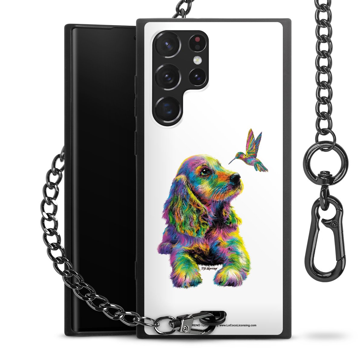 Die Handyhülle verfügt über eine mittig am unteren Rand platzierte Öse, an der die Metallkette stabil befestigt ist. Bestelle die Hülle einfach für Dein Smartphone-Modell, dann passt sie wie angegossen und Du brauchst sie bloß einmal anzudrücken. Handy in die Tasche, Karabiner an den Hosenbund – schon kann die Party starten.