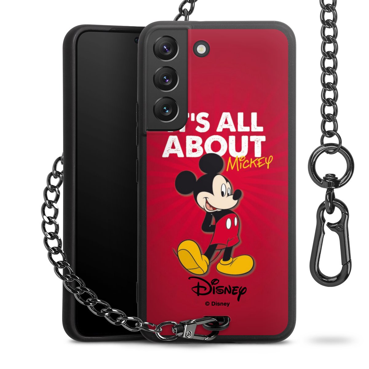Die Handyhülle verfügt über eine mittig am unteren Rand platzierte Öse, an der die Metallkette stabil befestigt ist. Bestelle die Hülle einfach für Dein Smartphone-Modell, dann passt sie wie angegossen und Du brauchst sie bloß einmal anzudrücken. Handy in die Tasche, Karabiner an den Hosenbund – schon kann die Party starten.