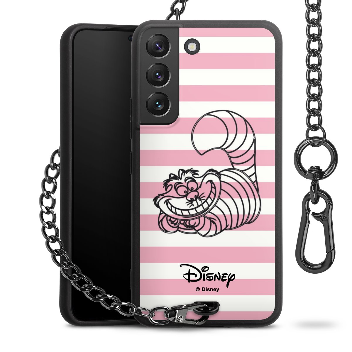 Die Handyhülle verfügt über eine mittig am unteren Rand platzierte Öse, an der die Metallkette stabil befestigt ist. Bestelle die Hülle einfach für Dein Smartphone-Modell, dann passt sie wie angegossen und Du brauchst sie bloß einmal anzudrücken. Handy in die Tasche, Karabiner an den Hosenbund – schon kann die Party starten.