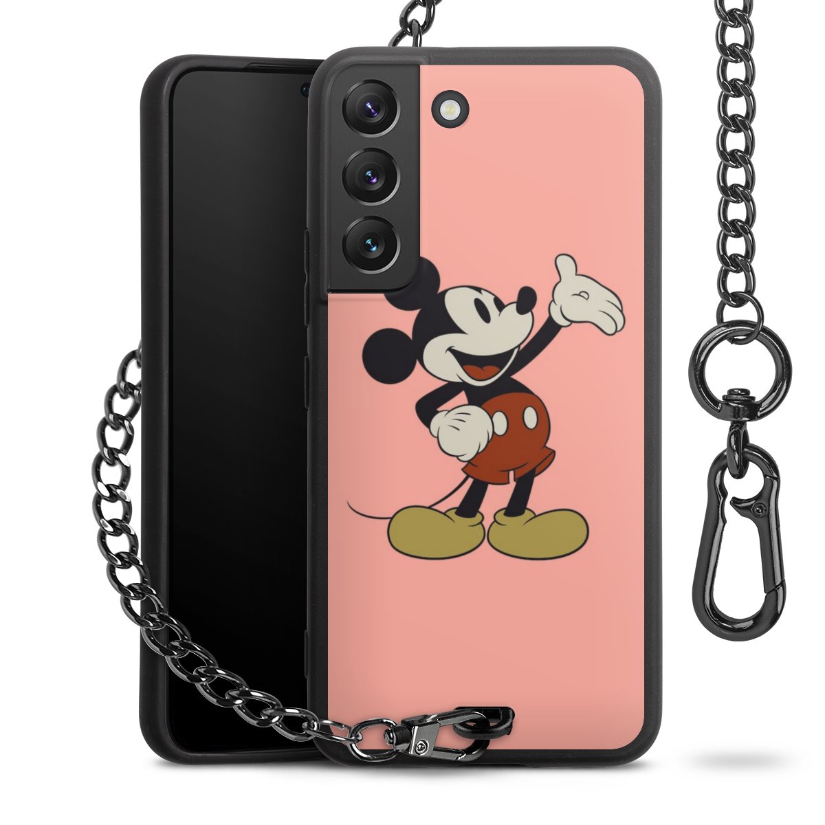 Die Handyhülle verfügt über eine mittig am unteren Rand platzierte Öse, an der die Metallkette stabil befestigt ist. Bestelle die Hülle einfach für Dein Smartphone-Modell, dann passt sie wie angegossen und Du brauchst sie bloß einmal anzudrücken. Handy in die Tasche, Karabiner an den Hosenbund – schon kann die Party starten.