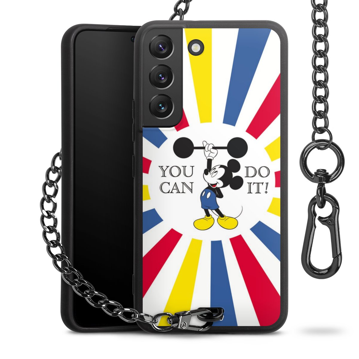 Die Handyhülle verfügt über eine mittig am unteren Rand platzierte Öse, an der die Metallkette stabil befestigt ist. Bestelle die Hülle einfach für Dein Smartphone-Modell, dann passt sie wie angegossen und Du brauchst sie bloß einmal anzudrücken. Handy in die Tasche, Karabiner an den Hosenbund – schon kann die Party starten.