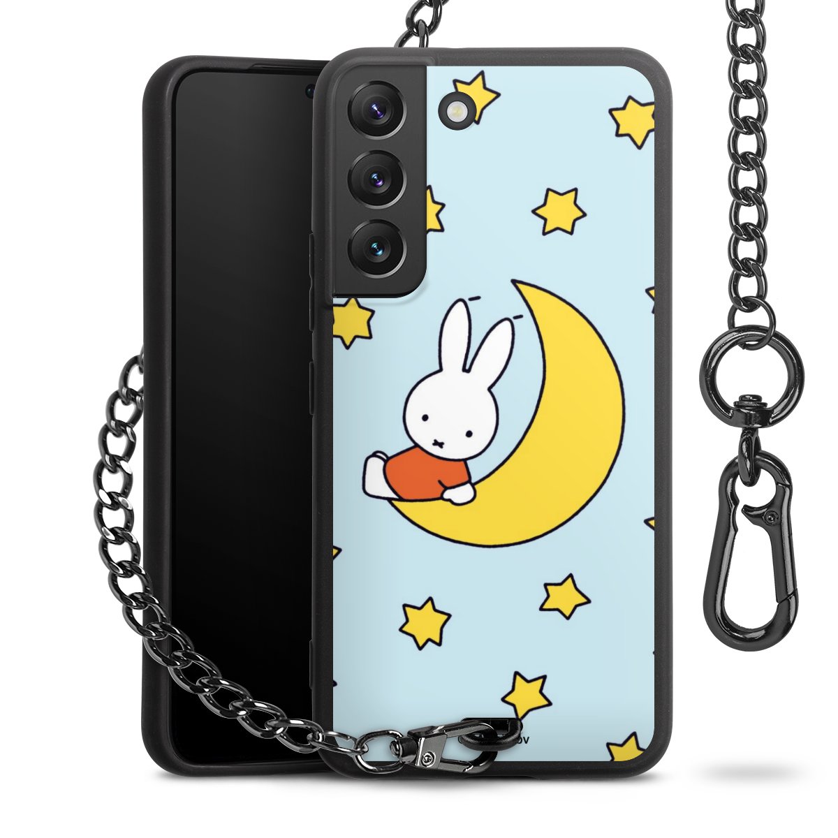 Die Handyhülle verfügt über eine mittig am unteren Rand platzierte Öse, an der die Metallkette stabil befestigt ist. Bestelle die Hülle einfach für Dein Smartphone-Modell, dann passt sie wie angegossen und Du brauchst sie bloß einmal anzudrücken. Handy in die Tasche, Karabiner an den Hosenbund – schon kann die Party starten.