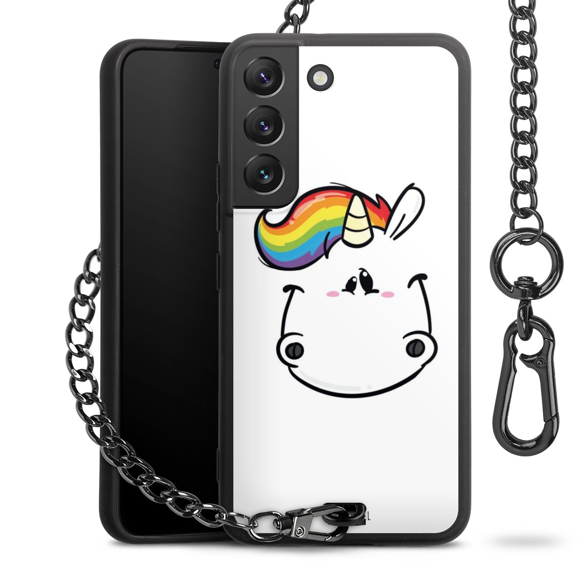 Die Handyhülle verfügt über eine mittig am unteren Rand platzierte Öse, an der die Metallkette stabil befestigt ist. Bestelle die Hülle einfach für Dein Smartphone-Modell, dann passt sie wie angegossen und Du brauchst sie bloß einmal anzudrücken. Handy in die Tasche, Karabiner an den Hosenbund – schon kann die Party starten.