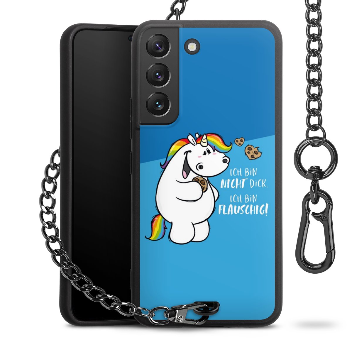 Die mattschwarze Silikon-Handyhülle besteht aus robustem TPU (thermoplastisches Polyurethan). Sie ist flexibel und schützt Dein Smartphone vor Stößen und Kratzern. Die Kette sowie der Karabinerhaken sind aus Metall in Gunmetal-Optik gefertigt. Für dieses Produkt kommen ausschließlich TÜV-geprüfte Materialien zum Einsatz.