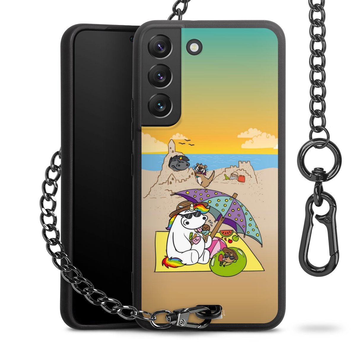 Die Handyhülle verfügt über eine mittig am unteren Rand platzierte Öse, an der die Metallkette stabil befestigt ist. Bestelle die Hülle einfach für Dein Smartphone-Modell, dann passt sie wie angegossen und Du brauchst sie bloß einmal anzudrücken. Handy in die Tasche, Karabiner an den Hosenbund – schon kann die Party starten.