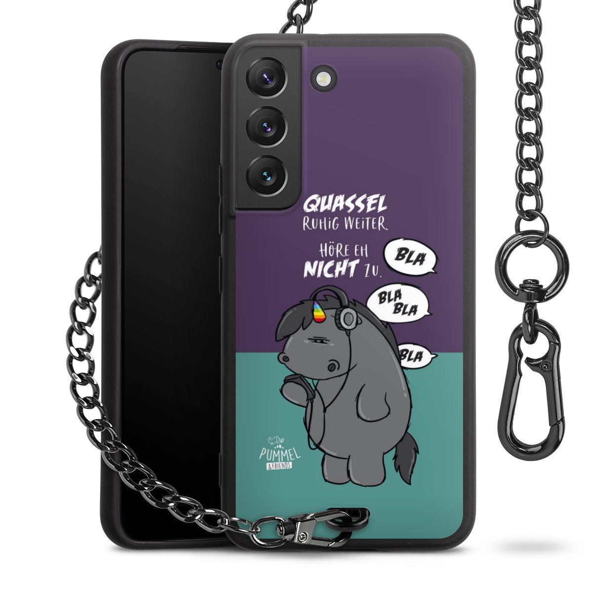 Die mattschwarze Silikon-Handyhülle besteht aus robustem TPU (thermoplastisches Polyurethan). Sie ist flexibel und schützt Dein Smartphone vor Stößen und Kratzern. Die Kette sowie der Karabinerhaken sind aus Metall in Gunmetal-Optik gefertigt. Für dieses Produkt kommen ausschließlich TÜV-geprüfte Materialien zum Einsatz.