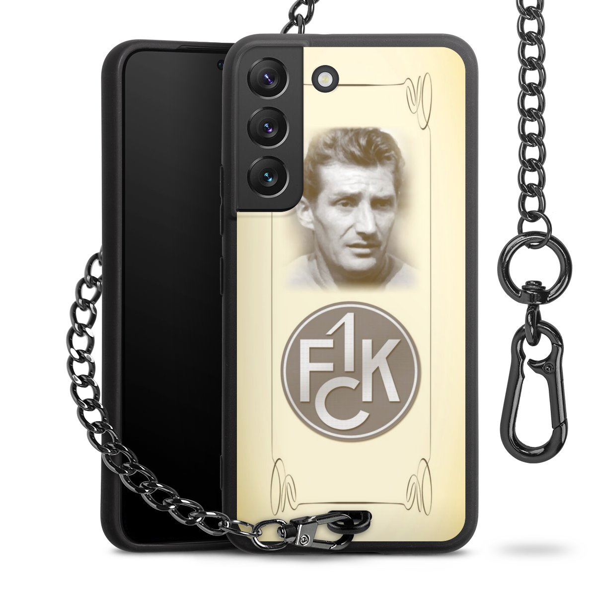 Die Handyhülle verfügt über eine mittig am unteren Rand platzierte Öse, an der die Metallkette stabil befestigt ist. Bestelle die Hülle einfach für Dein Smartphone-Modell, dann passt sie wie angegossen und Du brauchst sie bloß einmal anzudrücken. Handy in die Tasche, Karabiner an den Hosenbund – schon kann die Party starten.