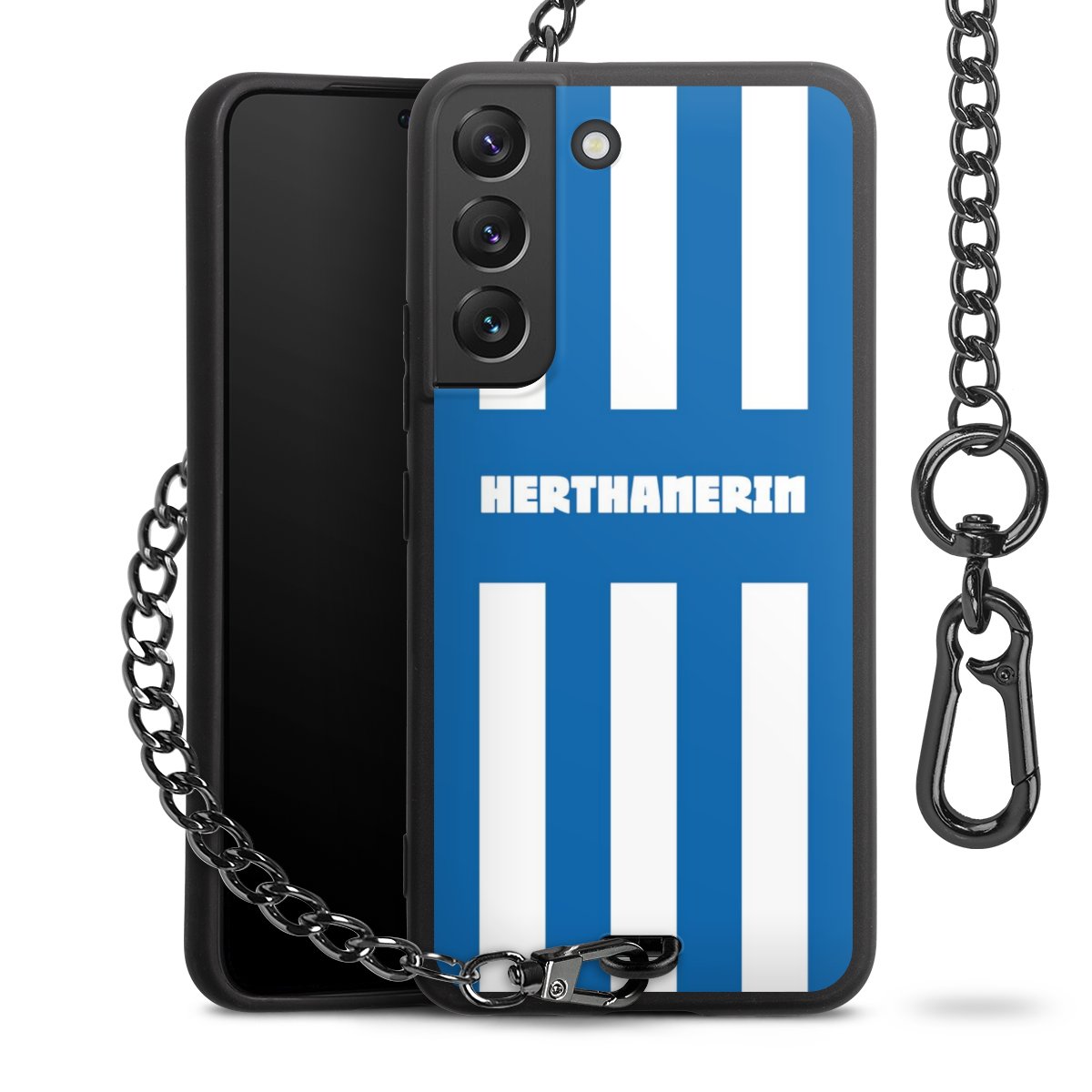 Die Handyhülle verfügt über eine mittig am unteren Rand platzierte Öse, an der die Metallkette stabil befestigt ist. Bestelle die Hülle einfach für Dein Smartphone-Modell, dann passt sie wie angegossen und Du brauchst sie bloß einmal anzudrücken. Handy in die Tasche, Karabiner an den Hosenbund – schon kann die Party starten.