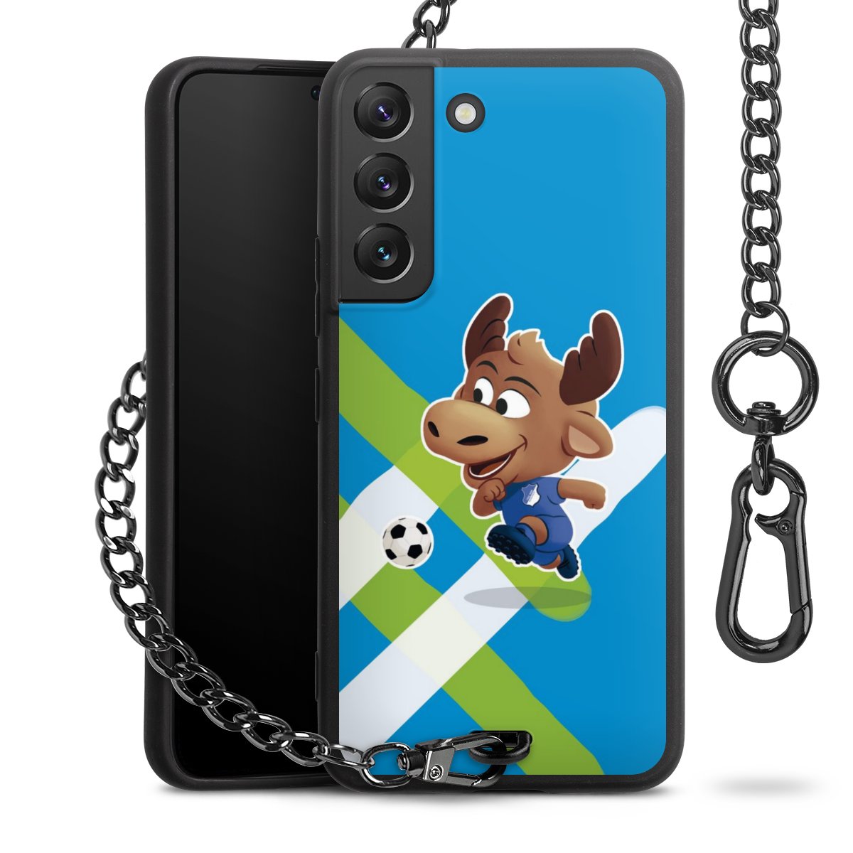 Die Handyhülle verfügt über eine mittig am unteren Rand platzierte Öse, an der die Metallkette stabil befestigt ist. Bestelle die Hülle einfach für Dein Smartphone-Modell, dann passt sie wie angegossen und Du brauchst sie bloß einmal anzudrücken. Handy in die Tasche, Karabiner an den Hosenbund – schon kann die Party starten.