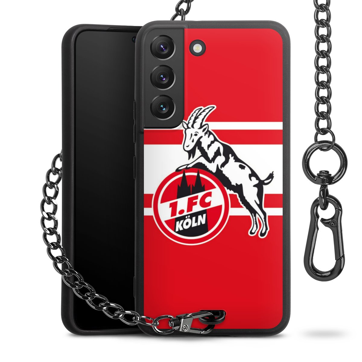 Die Handyhülle verfügt über eine mittig am unteren Rand platzierte Öse, an der die Metallkette stabil befestigt ist. Bestelle die Hülle einfach für Dein Smartphone-Modell, dann passt sie wie angegossen und Du brauchst sie bloß einmal anzudrücken. Handy in die Tasche, Karabiner an den Hosenbund – schon kann die Party starten.