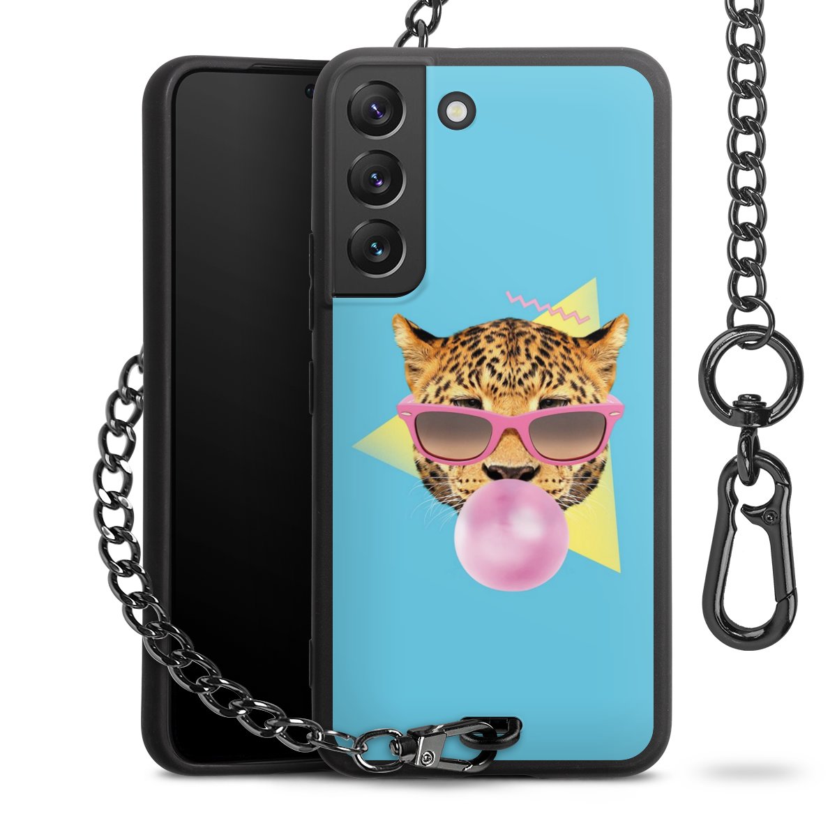 Die Handyhülle verfügt über eine mittig am unteren Rand platzierte Öse, an der die Metallkette stabil befestigt ist. Bestelle die Hülle einfach für Dein Smartphone-Modell, dann passt sie wie angegossen und Du brauchst sie bloß einmal anzudrücken. Handy in die Tasche, Karabiner an den Hosenbund – schon kann die Party starten.