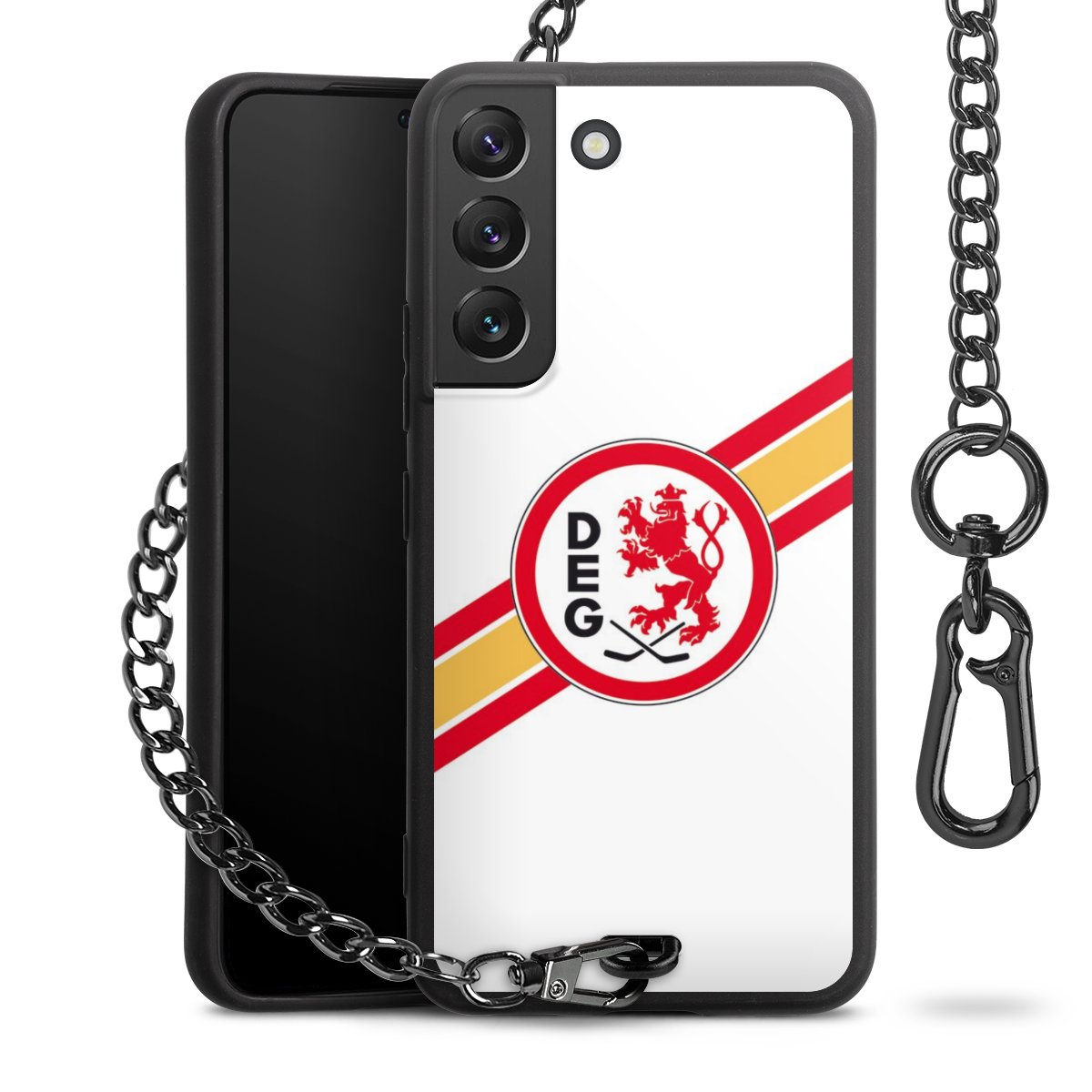 Die Handyhülle verfügt über eine mittig am unteren Rand platzierte Öse, an der die Metallkette stabil befestigt ist. Bestelle die Hülle einfach für Dein Smartphone-Modell, dann passt sie wie angegossen und Du brauchst sie bloß einmal anzudrücken. Handy in die Tasche, Karabiner an den Hosenbund – schon kann die Party starten.