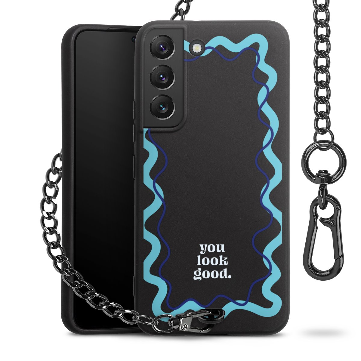 Die Handyhülle verfügt über eine mittig am unteren Rand platzierte Öse, an der die Metallkette stabil befestigt ist. Bestelle die Hülle einfach für Dein Smartphone-Modell, dann passt sie wie angegossen und Du brauchst sie bloß einmal anzudrücken. Handy in die Tasche, Karabiner an den Hosenbund – schon kann die Party starten.