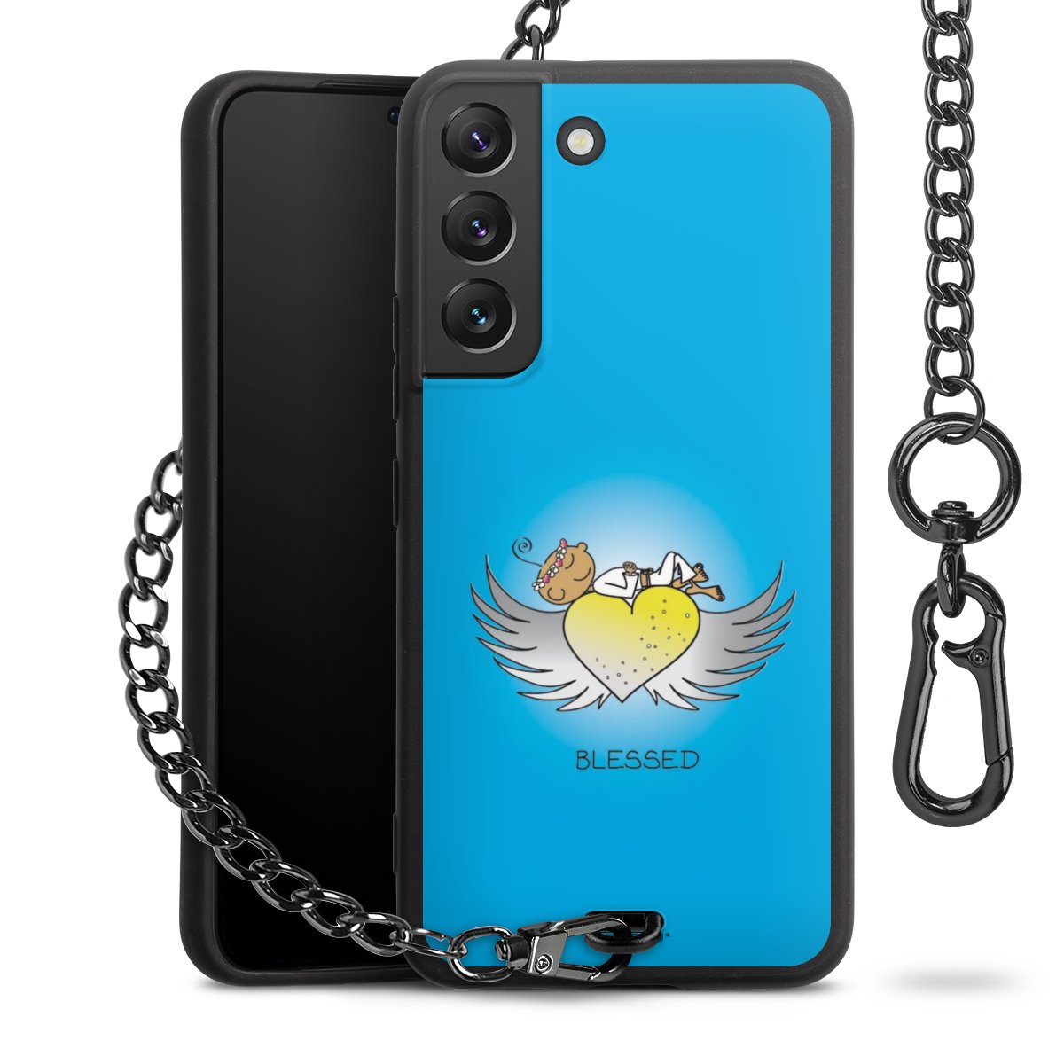 Die mattschwarze Silikon-Handyhülle besteht aus robustem TPU (thermoplastisches Polyurethan). Sie ist flexibel und schützt Dein Smartphone vor Stößen und Kratzern. Die Kette sowie der Karabinerhaken sind aus Metall in Gunmetal-Optik gefertigt. Für dieses Produkt kommen ausschließlich TÜV-geprüfte Materialien zum Einsatz.