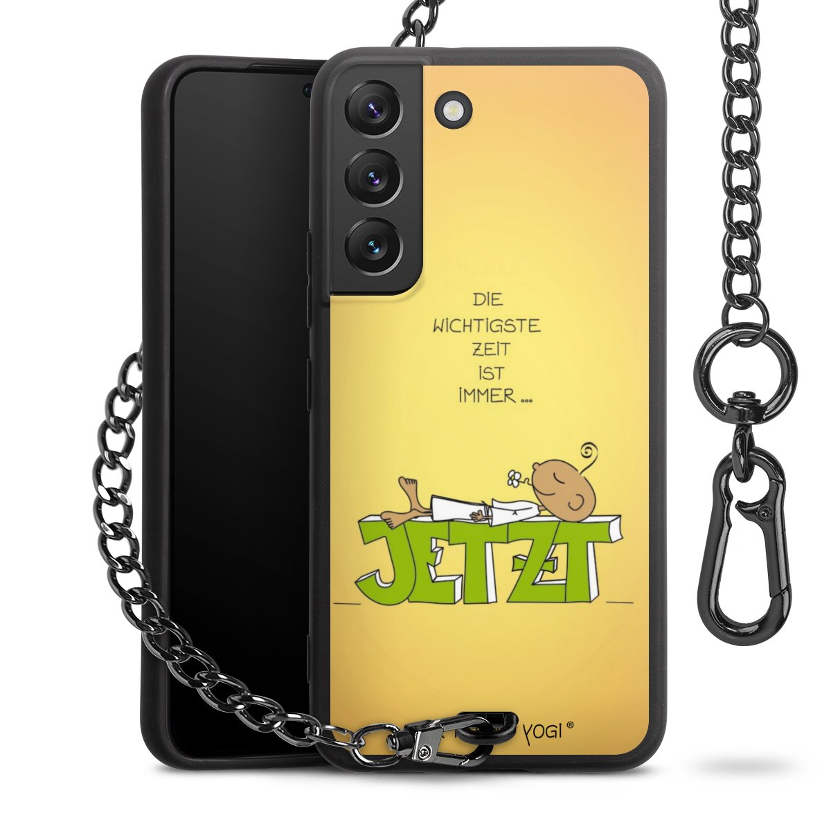 Die Handyhülle verfügt über eine mittig am unteren Rand platzierte Öse, an der die Metallkette stabil befestigt ist. Bestelle die Hülle einfach für Dein Smartphone-Modell, dann passt sie wie angegossen und Du brauchst sie bloß einmal anzudrücken. Handy in die Tasche, Karabiner an den Hosenbund – schon kann die Party starten.