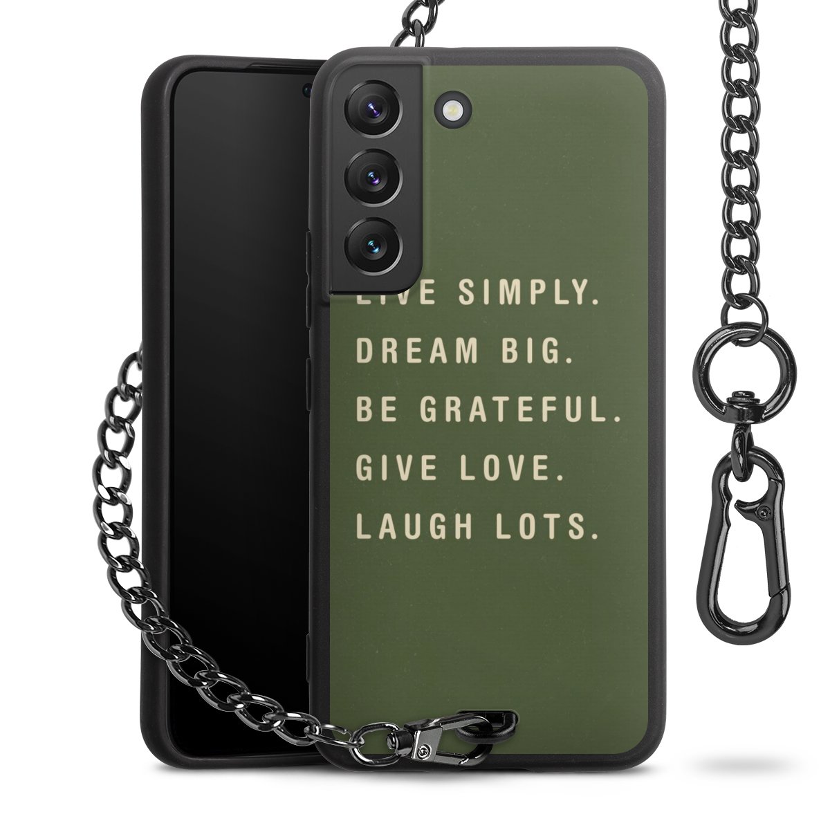 Die mattschwarze Silikon-Handyhülle besteht aus robustem TPU (thermoplastisches Polyurethan). Sie ist flexibel und schützt Dein Smartphone vor Stößen und Kratzern. Die Kette sowie der Karabinerhaken sind aus Metall in Gunmetal-Optik gefertigt. Für dieses Produkt kommen ausschließlich TÜV-geprüfte Materialien zum Einsatz.