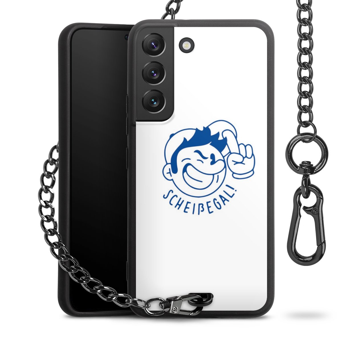 Die Handyhülle verfügt über eine mittig am unteren Rand platzierte Öse, an der die Metallkette stabil befestigt ist. Bestelle die Hülle einfach für Dein Smartphone-Modell, dann passt sie wie angegossen und Du brauchst sie bloß einmal anzudrücken. Handy in die Tasche, Karabiner an den Hosenbund – schon kann die Party starten.
