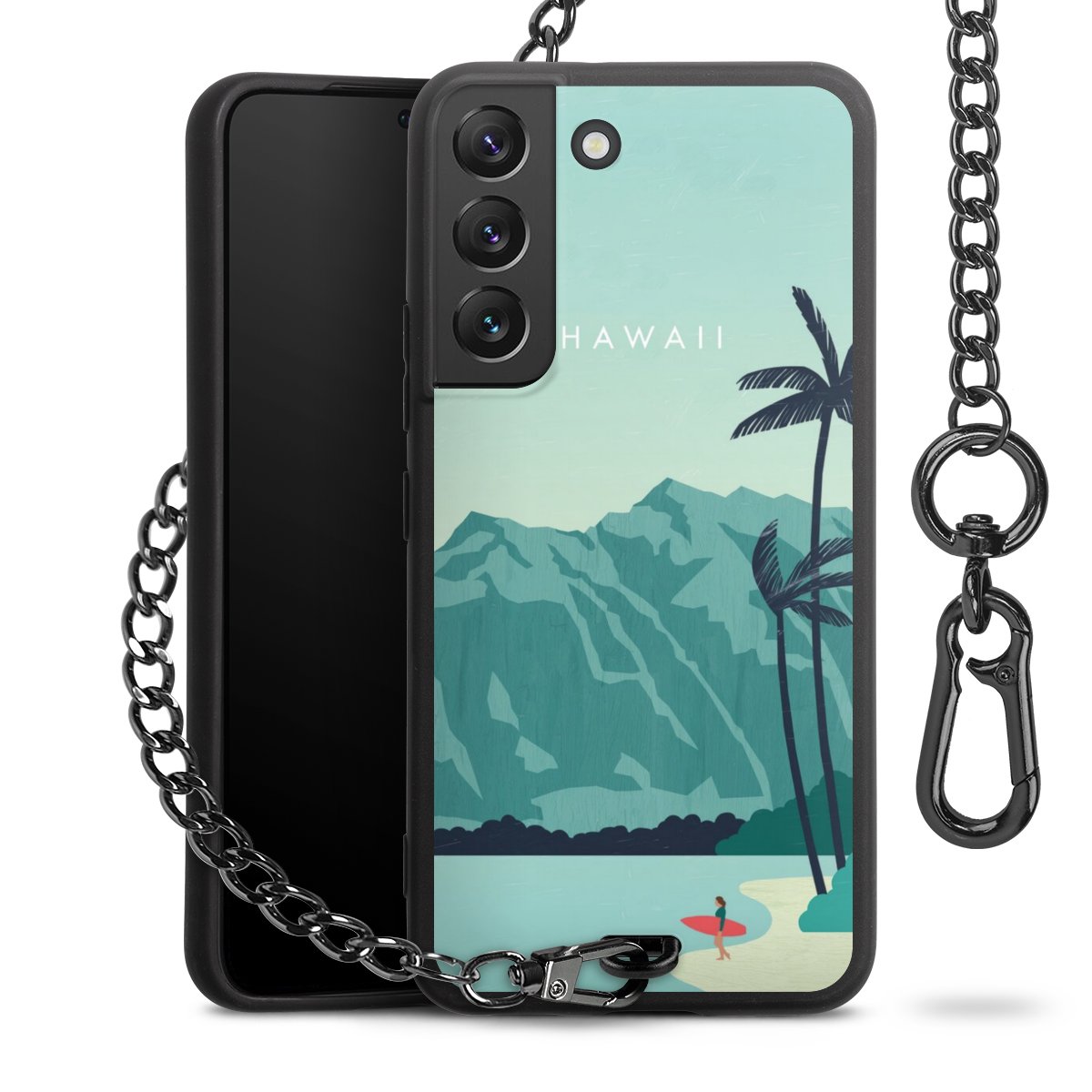 Die Handyhülle verfügt über eine mittig am unteren Rand platzierte Öse, an der die Metallkette stabil befestigt ist. Bestelle die Hülle einfach für Dein Smartphone-Modell, dann passt sie wie angegossen und Du brauchst sie bloß einmal anzudrücken. Handy in die Tasche, Karabiner an den Hosenbund – schon kann die Party starten.