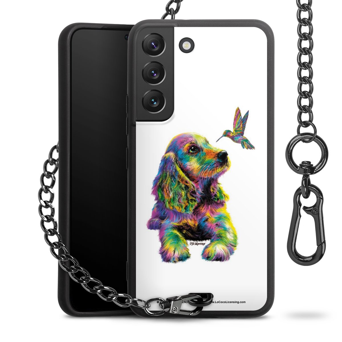 Die Handyhülle verfügt über eine mittig am unteren Rand platzierte Öse, an der die Metallkette stabil befestigt ist. Bestelle die Hülle einfach für Dein Smartphone-Modell, dann passt sie wie angegossen und Du brauchst sie bloß einmal anzudrücken. Handy in die Tasche, Karabiner an den Hosenbund – schon kann die Party starten.
