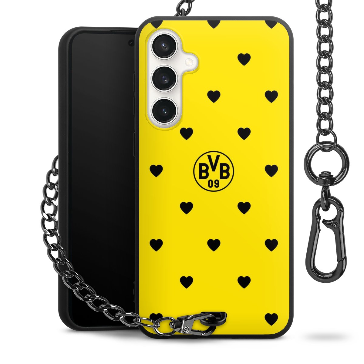 Die mattschwarze Silikon-Handyhülle besteht aus robustem TPU (thermoplastisches Polyurethan). Sie ist flexibel und schützt Dein Smartphone vor Stößen und Kratzern. Die Kette sowie der Karabinerhaken sind aus Metall in Gunmetal-Optik gefertigt. Für dieses Produkt kommen ausschließlich TÜV-geprüfte Materialien zum Einsatz.