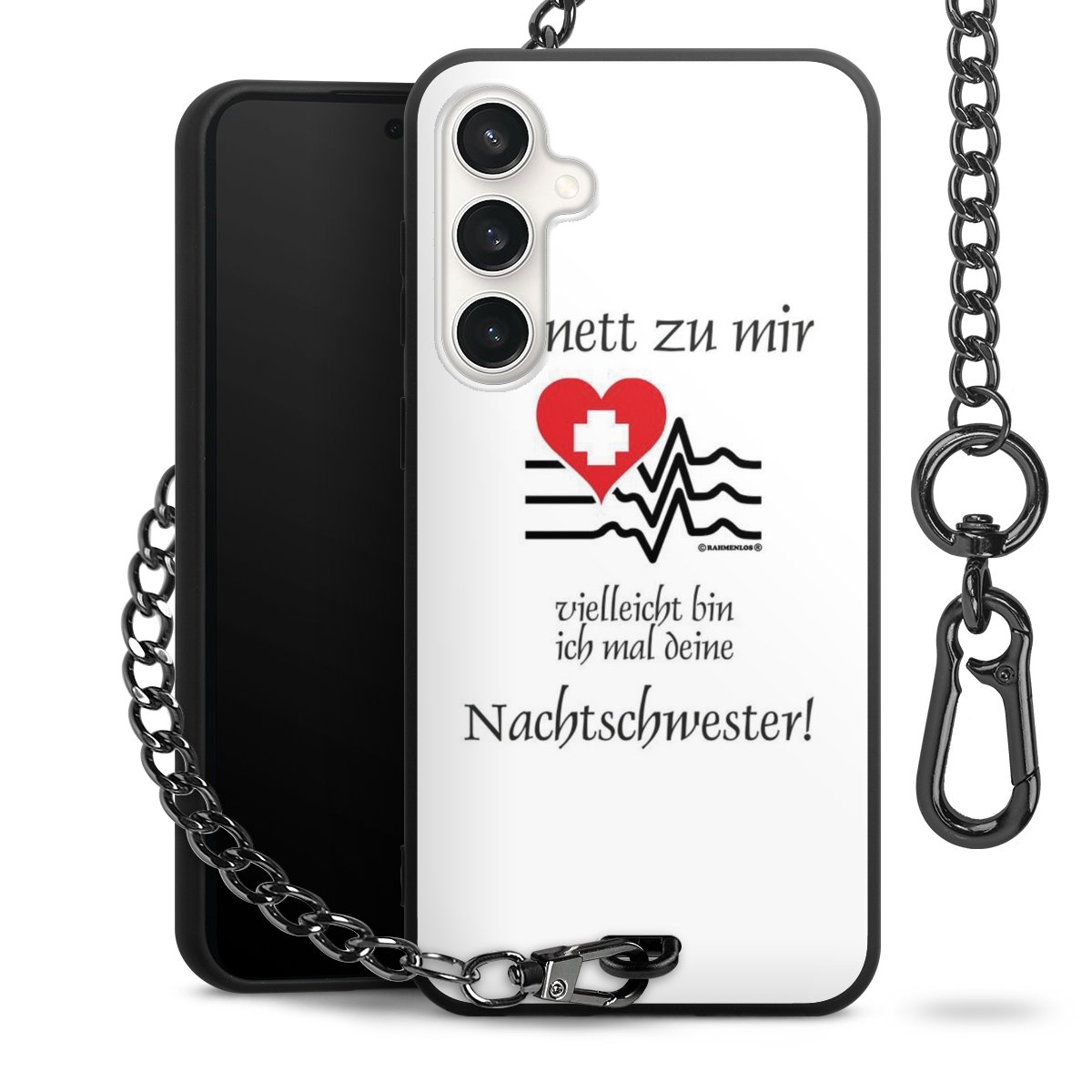 Die mattschwarze Silikon-Handyhülle besteht aus robustem TPU (thermoplastisches Polyurethan). Sie ist flexibel und schützt Dein Smartphone vor Stößen und Kratzern. Die Kette sowie der Karabinerhaken sind aus Metall in Gunmetal-Optik gefertigt. Für dieses Produkt kommen ausschließlich TÜV-geprüfte Materialien zum Einsatz.