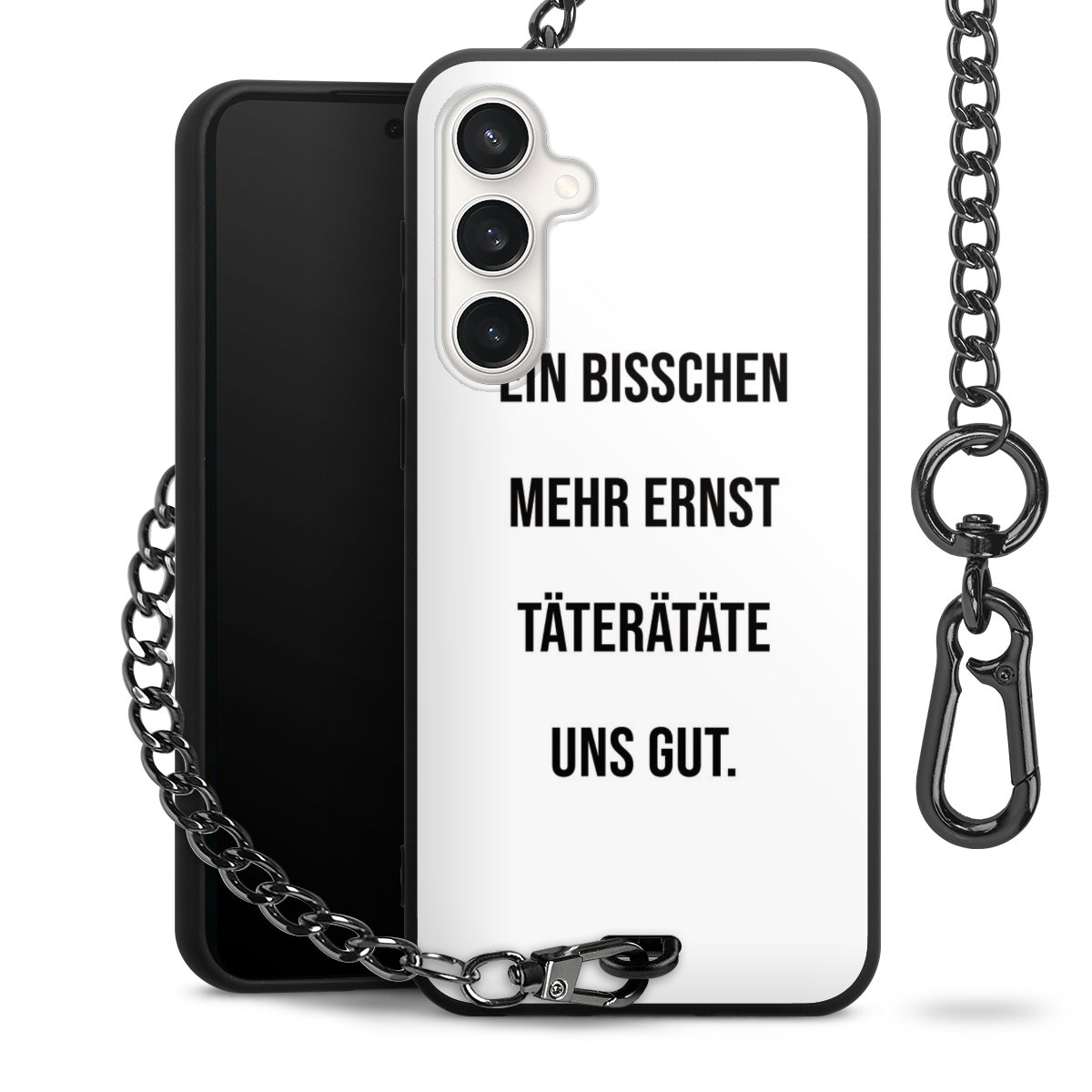 Die mattschwarze Silikon-Handyhülle besteht aus robustem TPU (thermoplastisches Polyurethan). Sie ist flexibel und schützt Dein Smartphone vor Stößen und Kratzern. Die Kette sowie der Karabinerhaken sind aus Metall in Gunmetal-Optik gefertigt. Für dieses Produkt kommen ausschließlich TÜV-geprüfte Materialien zum Einsatz.
