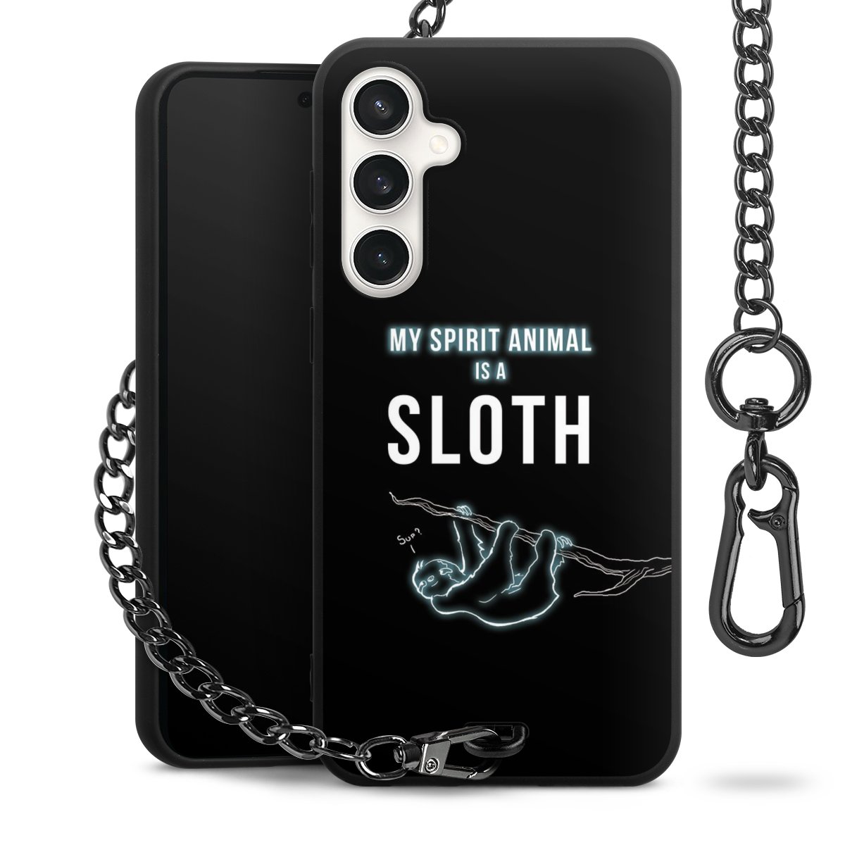 Die mattschwarze Silikon-Handyhülle besteht aus robustem TPU (thermoplastisches Polyurethan). Sie ist flexibel und schützt Dein Smartphone vor Stößen und Kratzern. Die Kette sowie der Karabinerhaken sind aus Metall in Gunmetal-Optik gefertigt. Für dieses Produkt kommen ausschließlich TÜV-geprüfte Materialien zum Einsatz.