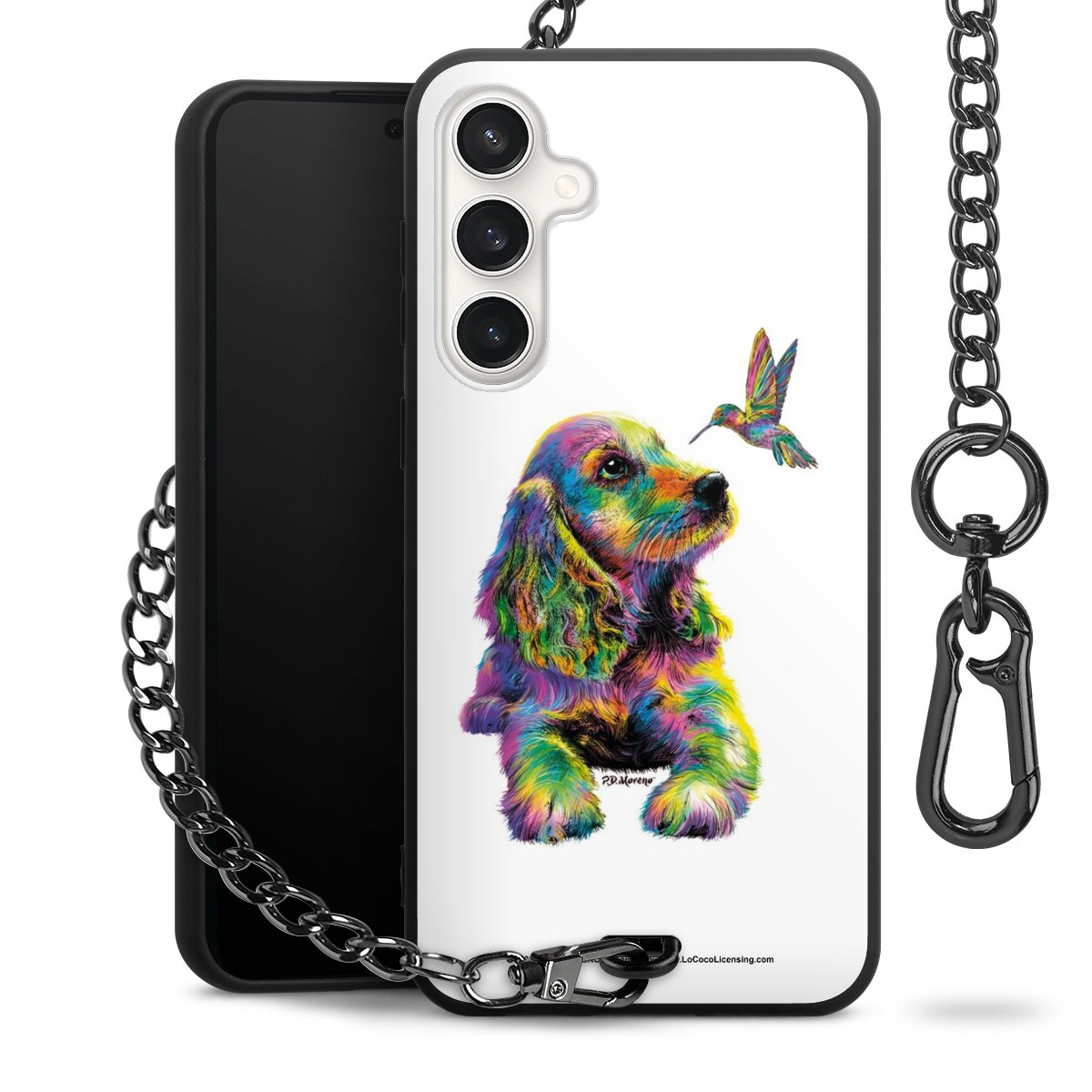 Die Handyhülle verfügt über eine mittig am unteren Rand platzierte Öse, an der die Metallkette stabil befestigt ist. Bestelle die Hülle einfach für Dein Smartphone-Modell, dann passt sie wie angegossen und Du brauchst sie bloß einmal anzudrücken. Handy in die Tasche, Karabiner an den Hosenbund – schon kann die Party starten.