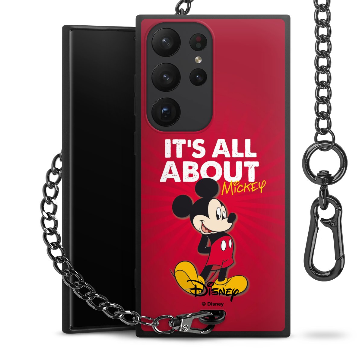 Die Handyhülle verfügt über eine mittig am unteren Rand platzierte Öse, an der die Metallkette stabil befestigt ist. Bestelle die Hülle einfach für Dein Smartphone-Modell, dann passt sie wie angegossen und Du brauchst sie bloß einmal anzudrücken. Handy in die Tasche, Karabiner an den Hosenbund – schon kann die Party starten.