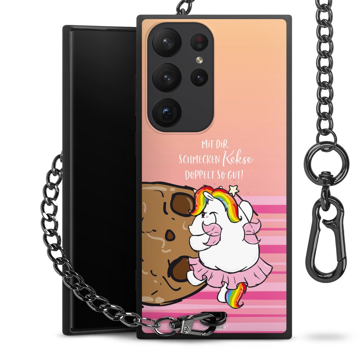 Die mattschwarze Silikon-Handyhülle besteht aus robustem TPU (thermoplastisches Polyurethan). Sie ist flexibel und schützt Dein Smartphone vor Stößen und Kratzern. Die Kette sowie der Karabinerhaken sind aus Metall in Gunmetal-Optik gefertigt. Für dieses Produkt kommen ausschließlich TÜV-geprüfte Materialien zum Einsatz.