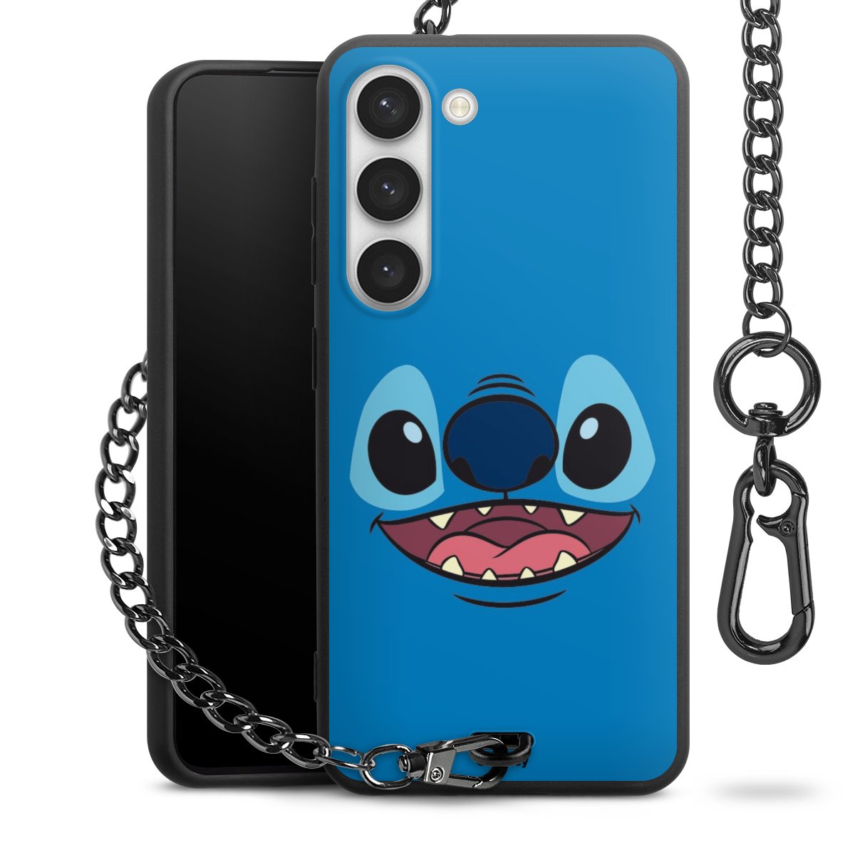 Die Handyhülle verfügt über eine mittig am unteren Rand platzierte Öse, an der die Metallkette stabil befestigt ist. Bestelle die Hülle einfach für Dein Smartphone-Modell, dann passt sie wie angegossen und Du brauchst sie bloß einmal anzudrücken. Handy in die Tasche, Karabiner an den Hosenbund – schon kann die Party starten.