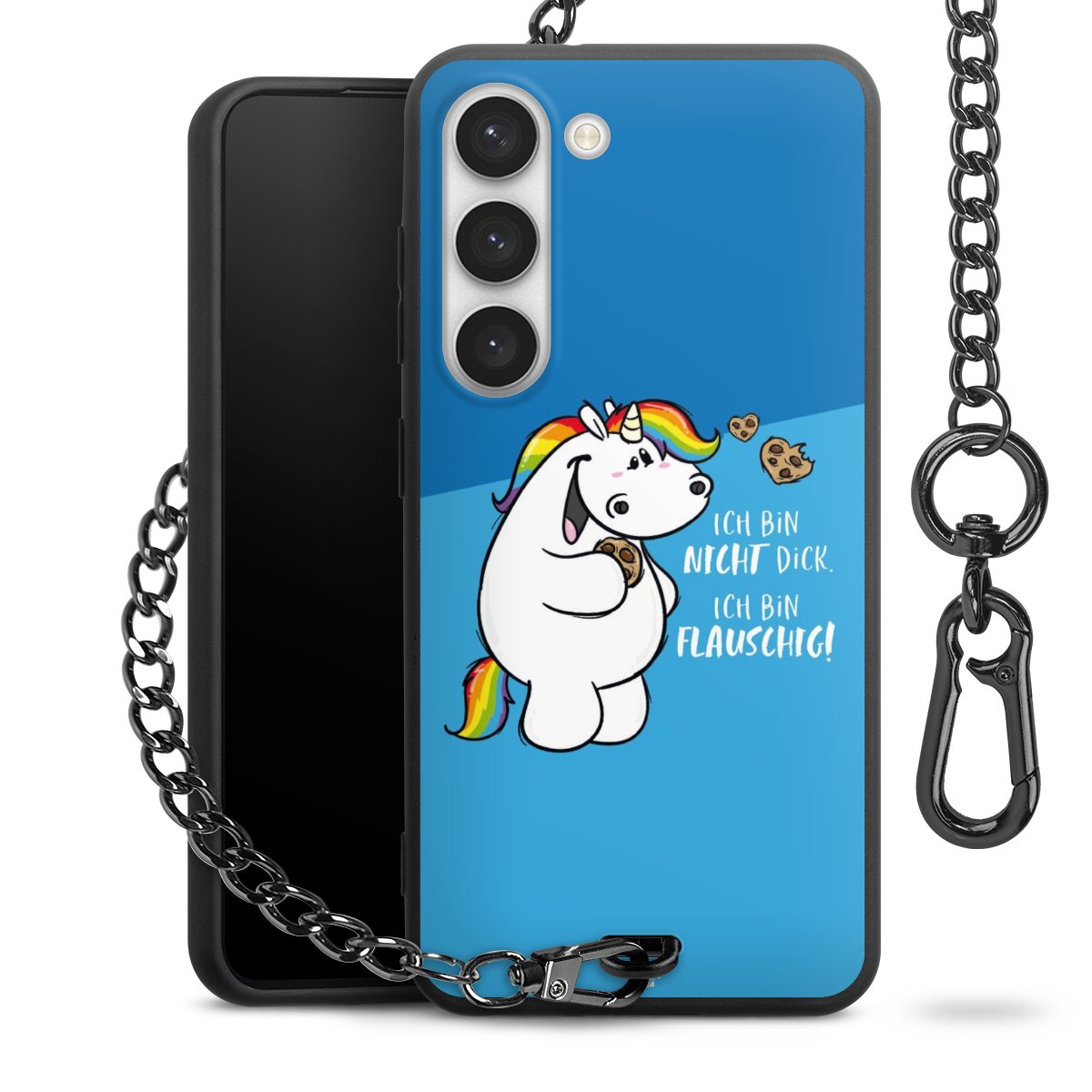 Die mattschwarze Silikon-Handyhülle besteht aus robustem TPU (thermoplastisches Polyurethan). Sie ist flexibel und schützt Dein Smartphone vor Stößen und Kratzern. Die Kette sowie der Karabinerhaken sind aus Metall in Gunmetal-Optik gefertigt. Für dieses Produkt kommen ausschließlich TÜV-geprüfte Materialien zum Einsatz.