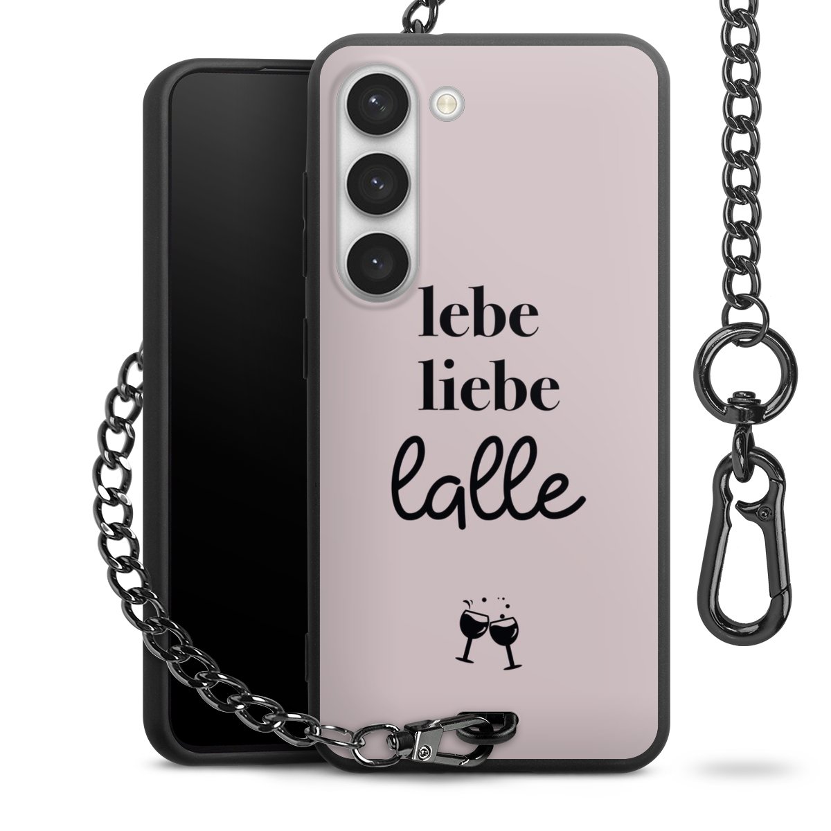 Die mattschwarze Silikon-Handyhülle besteht aus robustem TPU (thermoplastisches Polyurethan). Sie ist flexibel und schützt Dein Smartphone vor Stößen und Kratzern. Die Kette sowie der Karabinerhaken sind aus Metall in Gunmetal-Optik gefertigt. Für dieses Produkt kommen ausschließlich TÜV-geprüfte Materialien zum Einsatz.